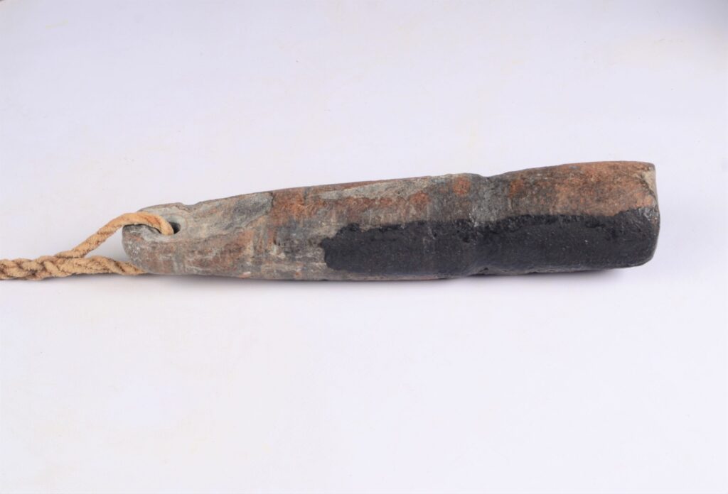 Widely used deeplead of 10 lbs with a leadline on a reel to find waterdepth and type of soil. The length of the line is 25 fathoms. The first five fathoms are marked with blue tarlaulin flag around the fathom. Thereafter every two and a half fathom is indicated with a yellow flag.