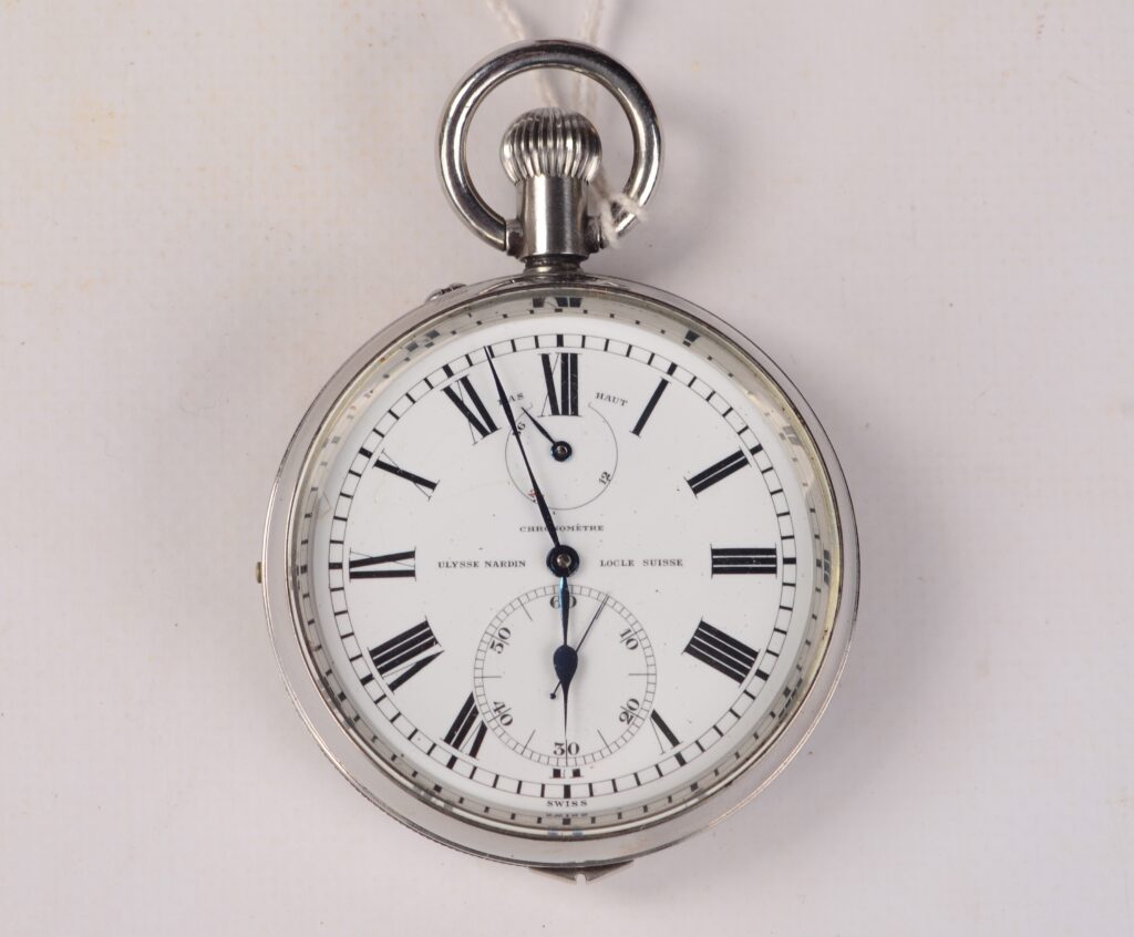 Very rare and large deck watch in a case of stainless steel made by Ulysse Nardin. Special about this specimen is the electrical mechanism by which the watch can be used as a master timekeeper or mother clock. Stored in a three tier deck box with key and carrying case lined with green baize. Both made of mahogany. The white enamel dial with subsidiaries for seconds and power reserve. The 24 is marked in red to indicate when the watch should be wound. Blue steel hands. Stainless steel case with electrical contact in the band and sprung electrical contacts and circuitry under the mahogany cover. Case and watch numbered 124500. The closing lid of the watch and the inner lid are numbered 669338.