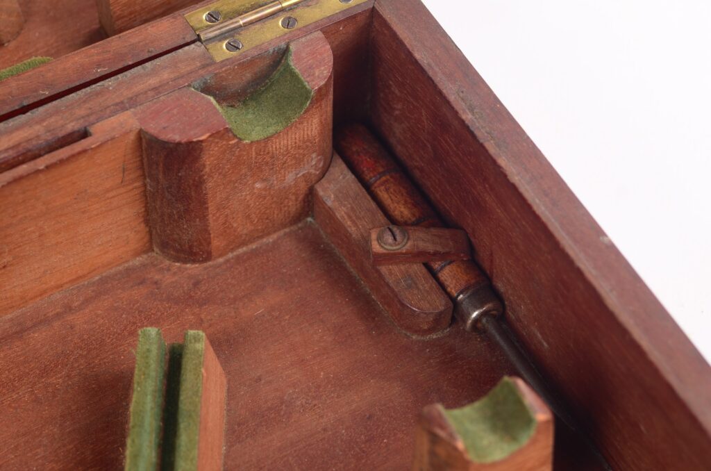 - An ebony handle, decorated in metal, screwed into the back of the instrument.