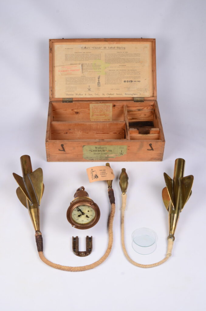A finely made ship’s log to measure the distance covered through the water within a certain time. Distance divided bij the time in hours, gives the speed in knots through the water.