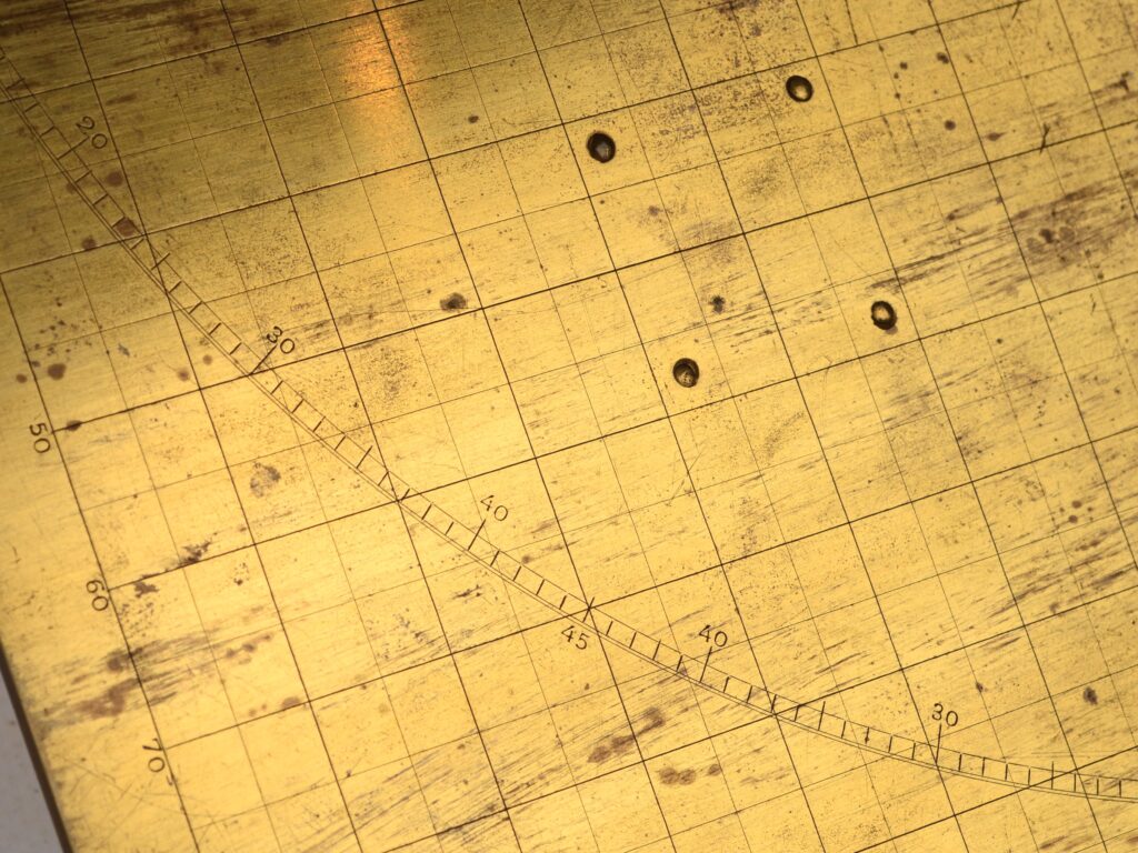 A grid has been applied to the square plateau, which is subdivided into 10 x 10 numbered areas, which in turn are subdivided into 4 areas each. The quarter circle has 2 degree divisions from 0 – 45 degrees.